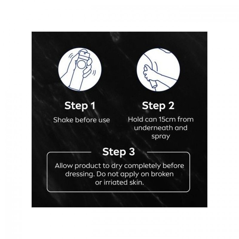 Directions: Apply in the morning or after showering. Shake well before use and then hold the can 15cm from the underarm and spray. Do not apply to broken or irritated skin. Allow product to dry completely before dressing.