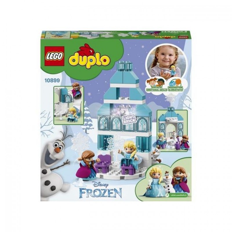 Join Disney’s Anna, Elsa and Olaf at the LEGO® DUPLO® l Disney 10899 Frozen Ice Castle to share imaginative play and precious developmental milestones with your preschooler. As toddlers role-play with their favourite Disney Frozen characters, they improve their language and fine motor skills, and develop social and emotional awareness. Talk about Elsa's relationship with her sister Anna. Enjoy open-ended creative fun with Olaf the snowman. With a multicoloured light brick feature illuminating the castle at the push of a button, you and your little one will have endless enjoyment recreating scenes from Disney’s Frozen movie and dreaming up stories of your own with this sparkling Ice Castle toddler toy building set.image