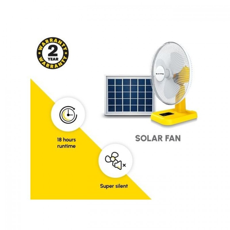 • With a 5100mAh battery, it has a runtime of up to 18 hours on a single day’s charge on the low speed mode.On average, day-to-day use, the Sun King Solar Fan requires charging once every two days.